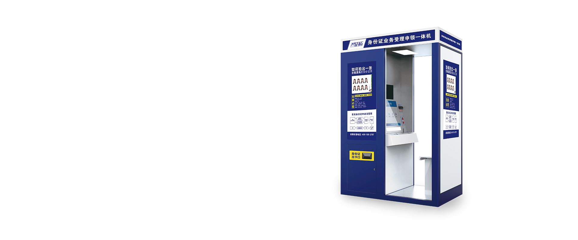 自助拍摄各个尺寸标准寸照。具备智能灯光、背景、自动调节色彩功能,