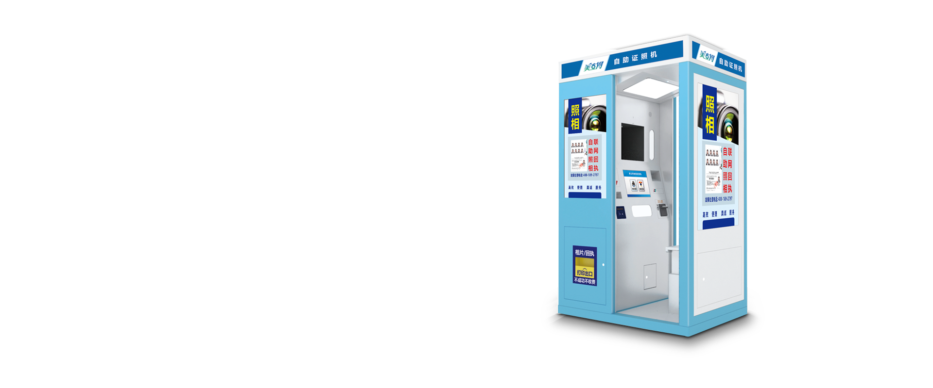 自助拍摄各个尺寸标准寸照。具备智能灯光、背景、自动调节色彩功能, 营造